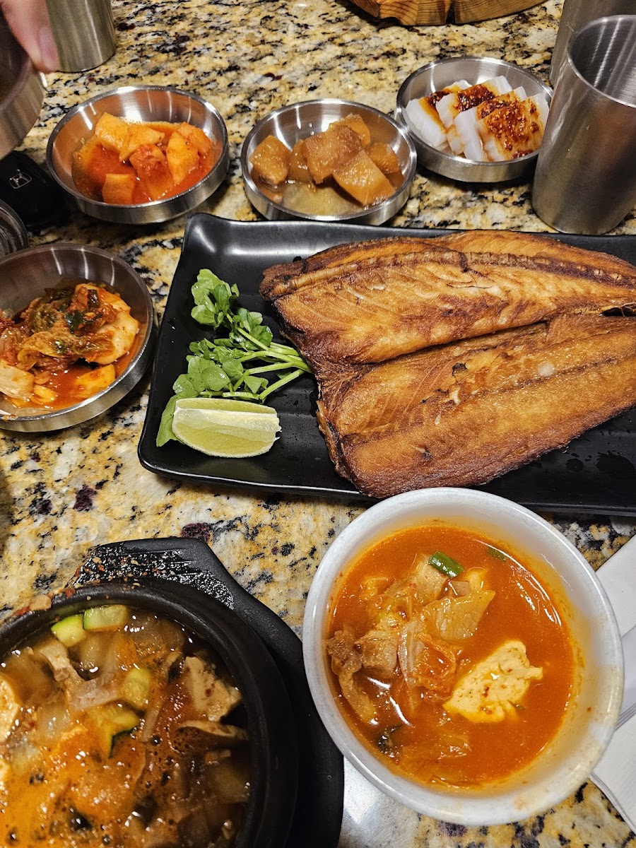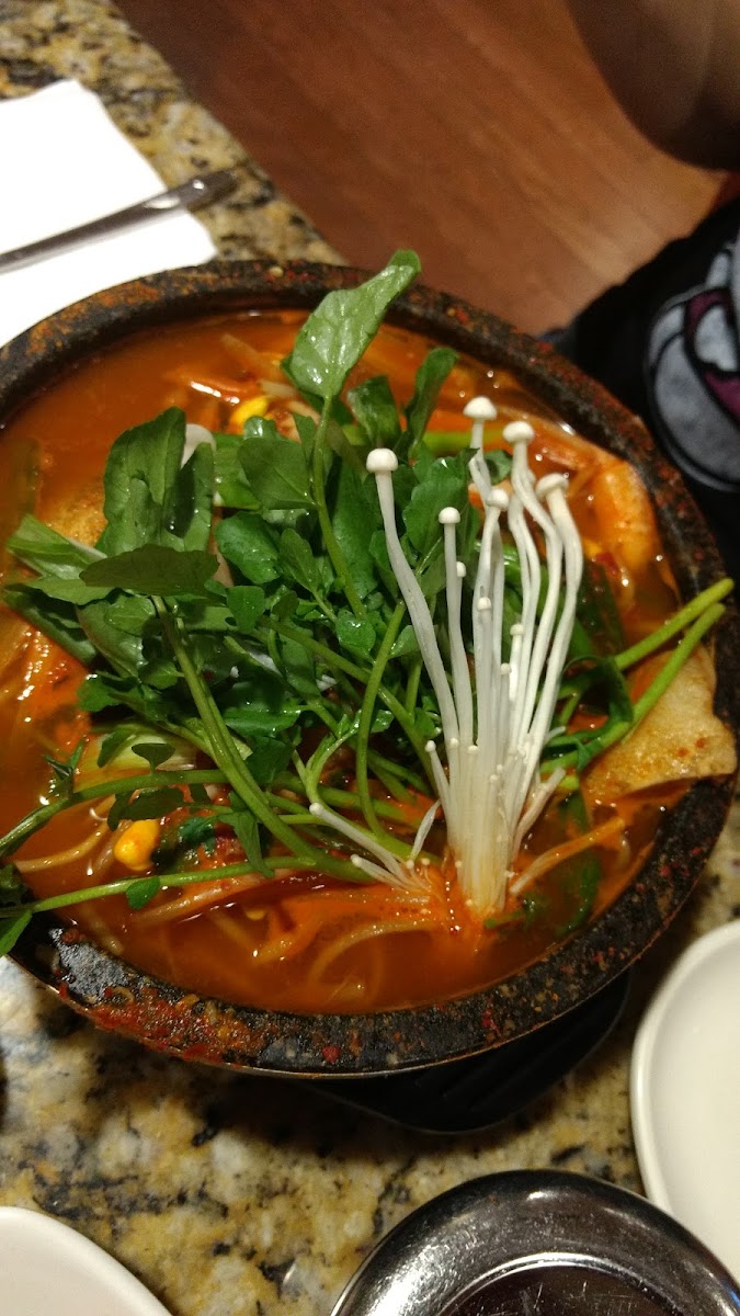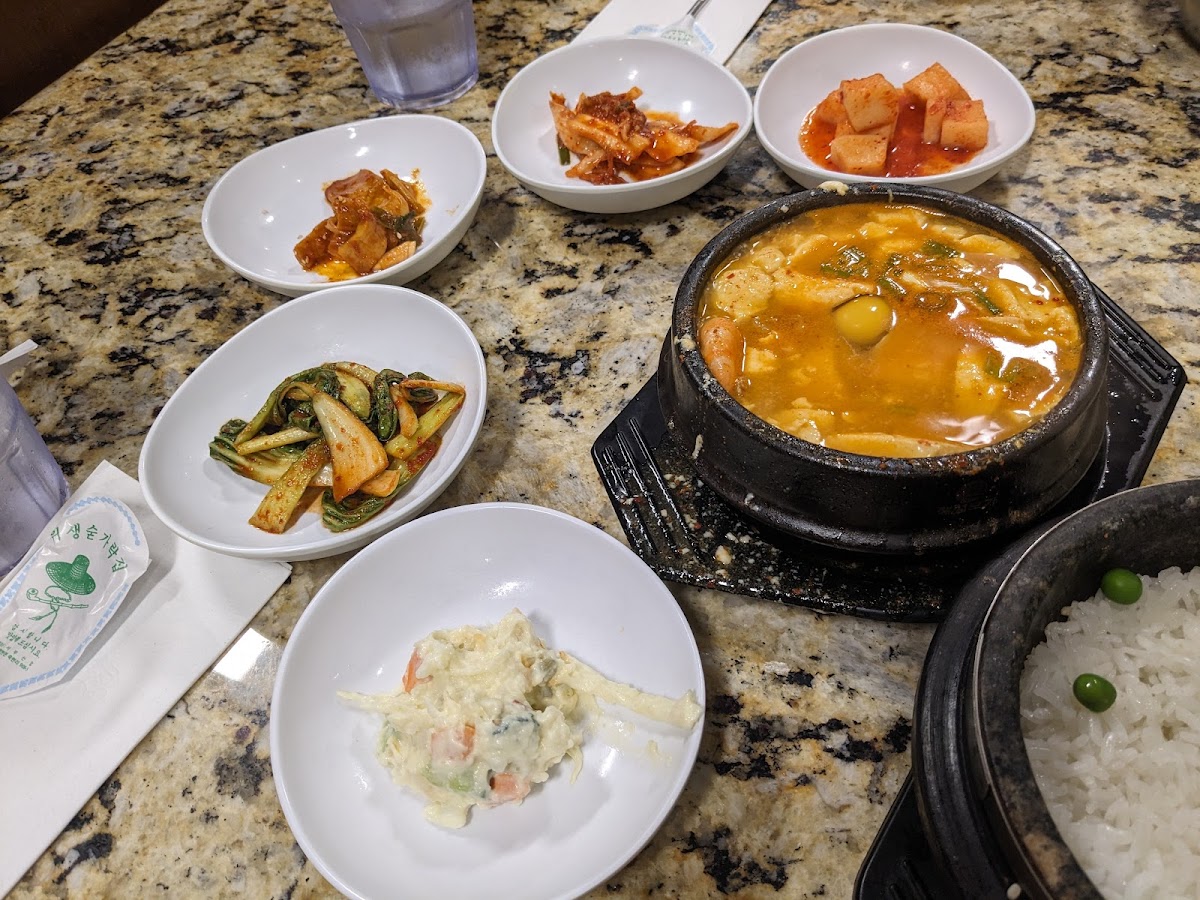 Wow best soondubu I've had, the broth is rich, thick, so good! Busy-ish for Sunday lunch, no problems with parking, & they were playing Christmas music! They have high chairs for the kiddos